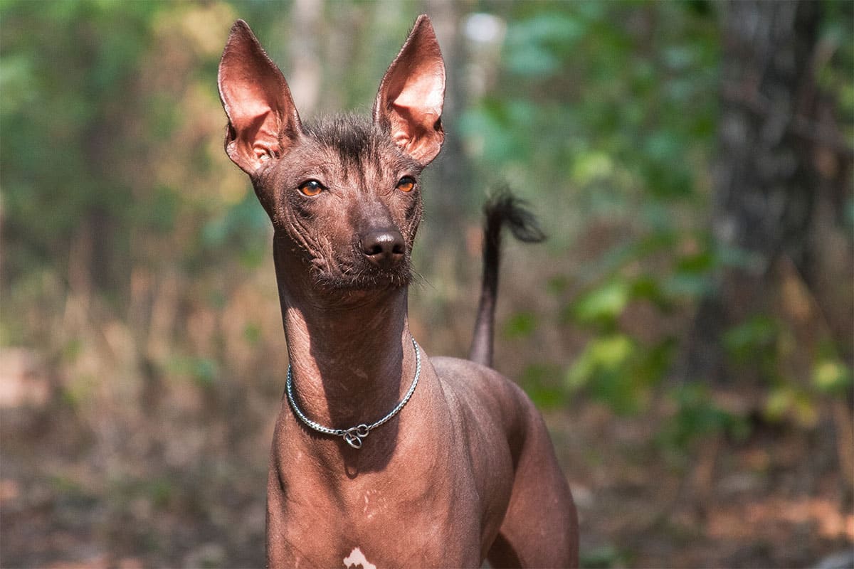 Xoloitzcuintli with sleek skin and alert stance, embodying sacred ancient Mexican heritage.