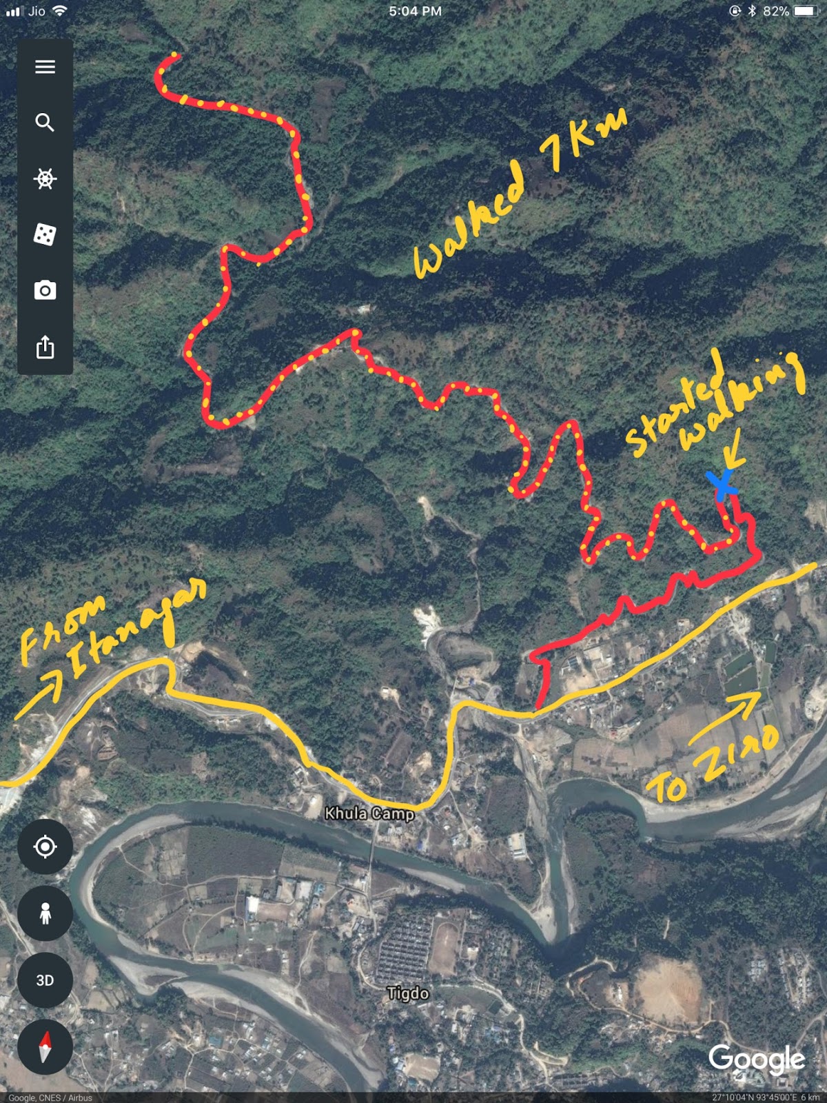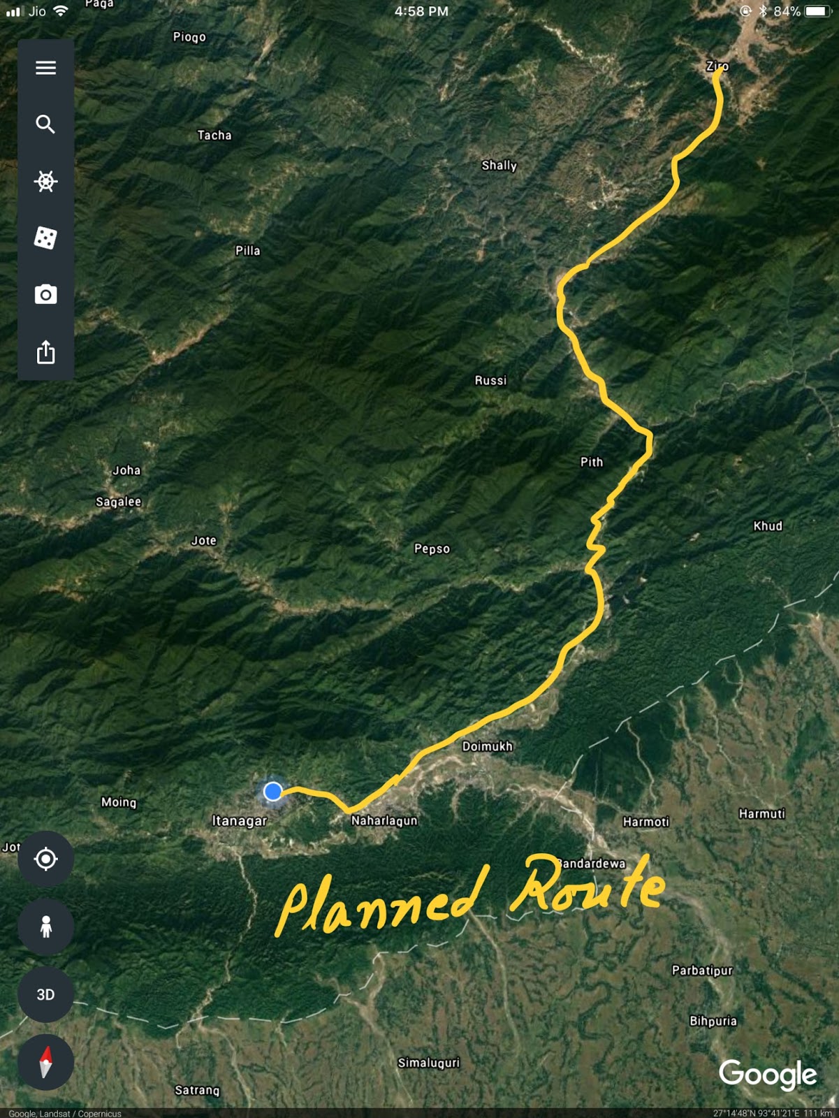 That being so – I made a decision that I’ll simply take a automobile and go on a highway to Ziro. That I felt would give me a very good start line. And likewise raise my spirits a bit that was not so excessive studying of looking within the state. So I deliberate the journey as proven on the map beneath, a complete of 105 km that takes about 4 hours or so to cowl as a result of situation of the roads – I used to be informed.