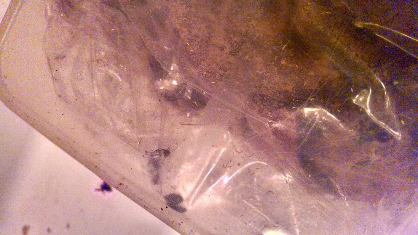 I’ve been giving the canines the treats each few nights and was nearly on the finish of the contents of the siphoned off amount (which had been transferred to a different hermetic container once we arrived again from trip).  Final night time I gave Raleigh a bit after which went to discover a smaller piece for Duncan (our Chihuahua) once I seen a pair bugs, the likes of which I’ve by no means seen earlier than in my home or my yard. Then I went to the backup container and checked and it was crawling with bugs and little brown worms. I took an image via the underside of the container, however fairly actually you possibly can solely see one bug.  I wasn’t going to open this in my home.   I threw all of the product right into a plastic bag and sealed it tightly.