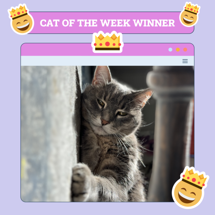 | Enjoyable Truth: | Henry is a climber. I’ve a half wall within the entry of my dwelling, he loves to leap up on high of it and survey his kingdom from that top perch. I like this picture due to the looming shadow on the ceiling behind him. |