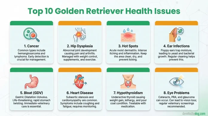 Infographic showing the 10 most common golden retriever health issues with early warning signs listed for each condition