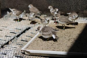 9 younger Western Snowy Plovers roam in an out of doors enclosure at Worldwide Hen Rescue’s San Francisco Bay-Delta Wildlife Middle. Photograph by Kelly Beffa – Worldwide Hen Rescue