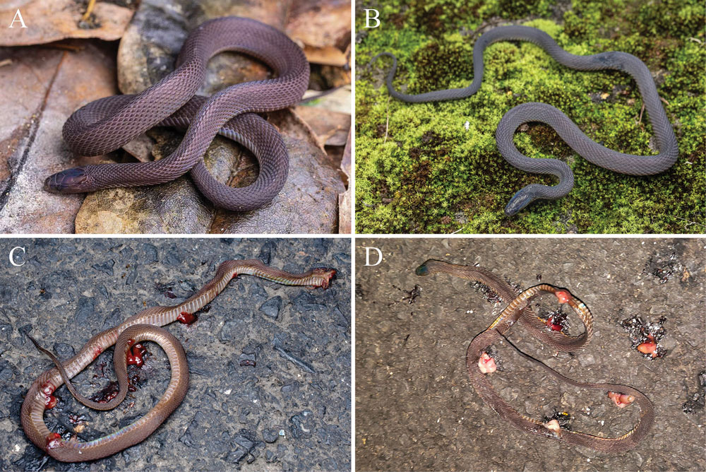 Reside or contemporary specimens of paratypes of Achalinus mirabilis sp. nov. A. SMNH 20250126, subadult male; B. QHU R2025053, grownup male; C. QHU R2025054, grownup feminine; D. SYS r003125, grownup feminine. Pictures by J.H. Hu (A–C) and H.J. Chen (D). Snakes C and D have been street killed specimens.
