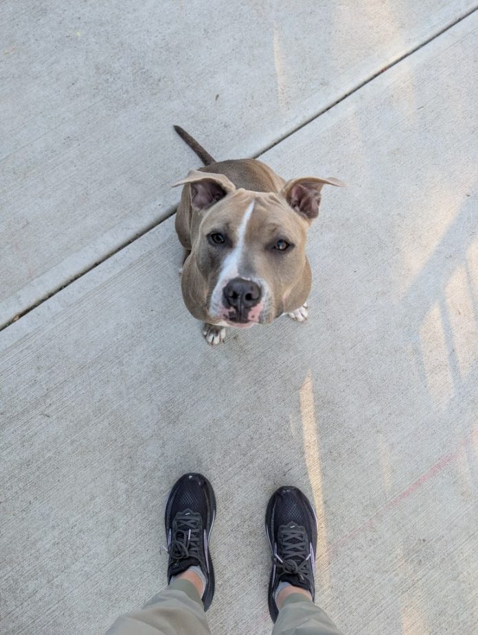 In the bottom of the frame are a pair of black running shoes sticking out of legs with green pants. Across from the photographer sits a little brown pit bull puppy who has a white strip running from the top of her forehead to her nose.