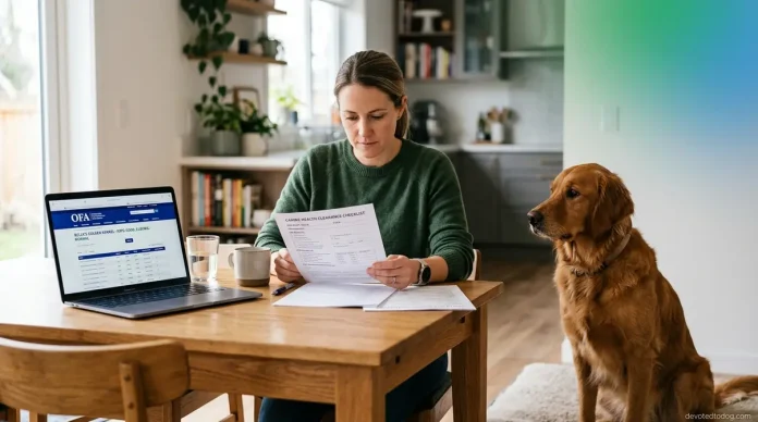 Person verifying golden retriever breeder health clearances on OFA database with checklist
