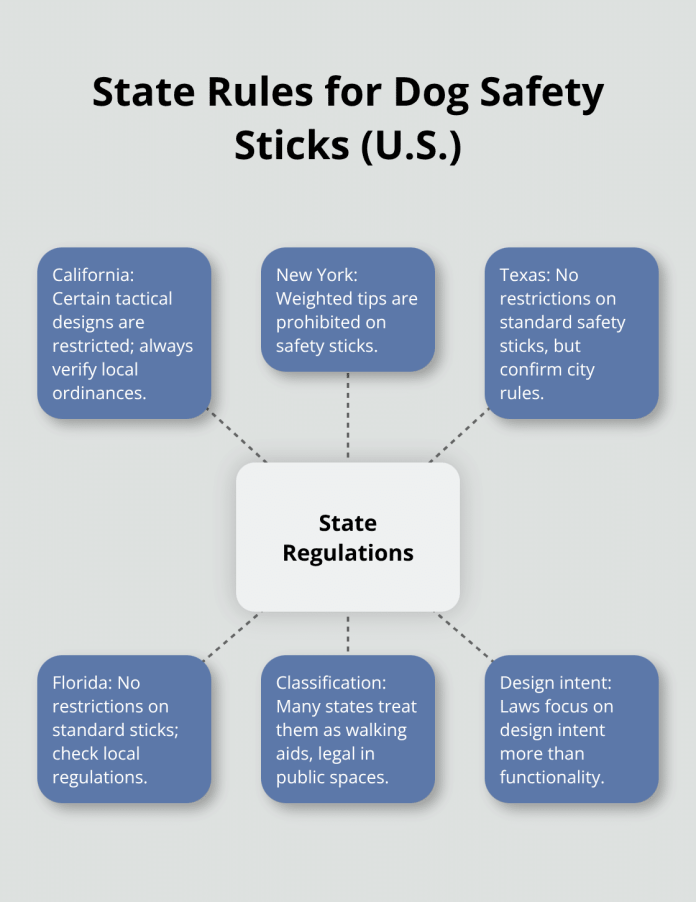 Most states classify canine security sticks as strolling aids reasonably than weapons, which makes them authorized to hold in public areas. Nevertheless, California restricts sure tactical designs, whereas New York prohibits weighted ideas. Texas and Florida haven’t any restrictions on commonplace security sticks (at all times verify native ordinances earlier than buy, as metropolis laws can differ from state legal guidelines). The important thing distinction lies in design intent reasonably than performance.